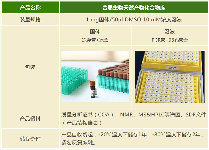 普思生物專注于天然產(chǎn)物研究與產(chǎn)業(yè)化應(yīng)用二十載,擁有許多積累了豐富分離純化經(jīng)驗的技術(shù)人員,具備強大的創(chuàng)新研發(fā)生產(chǎn)力。公司聚焦于天然藥物研究開發(fā)需求,旨在為中藥現(xiàn)代化研究及先導(dǎo)化合物的發(fā)現(xiàn)提供高質(zhì)量物質(zhì)基礎(chǔ)?,F(xiàn)結(jié)合化合物結(jié)構(gòu)、來源、功能與應(yīng)用方向等推薦以下精選天然產(chǎn)物化合物庫: